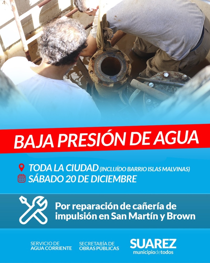 Se solicita restringir el consumo de agua de red en toda la ciudad y barrio Islas Malvinas este sábado 20 de diciembre, por reparación de cañería de impulsión en la intersección de las calles San Martín y Brown.