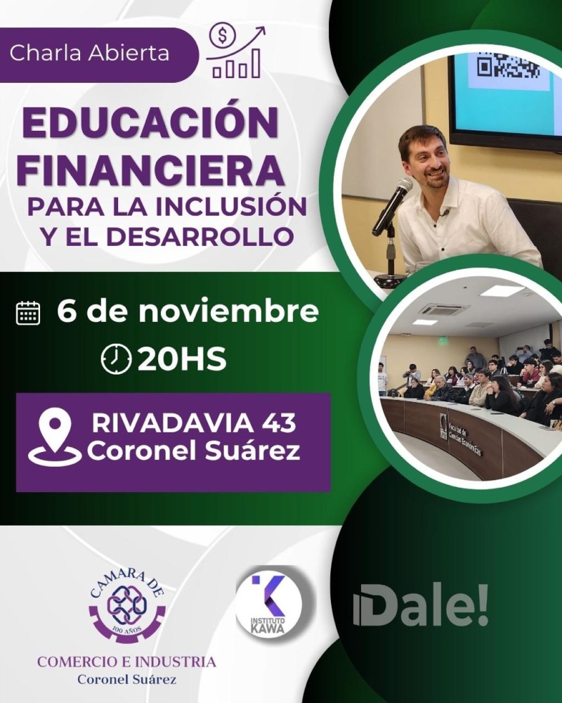 Será este jueves 6 de noviembre a las 20 en instalaciones de la Cámara de Comercio e Industria de Coronel Suárez (Rivadavia 43), en el marco del programa DALE que impulsa la senadora Nerina Neumann Losada junto al Instituto Kawa (Academia de Educación Financiera), y la mencionada Cámara local. La charla es abierta y gratuita.