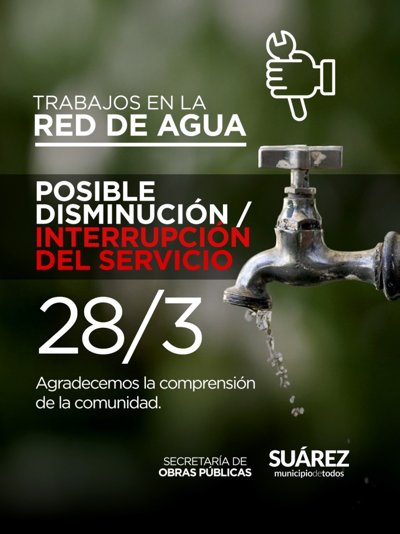 La Secretaría de Obras Públicas informa que este sábado 28 de marzo se llevarán adelante trabajos de reparación en el sistema de agua potable, tras la rotura de un caño de impulsión ubicado en la intersección de calle San Martín y avenida Sixto Rodríguez.
