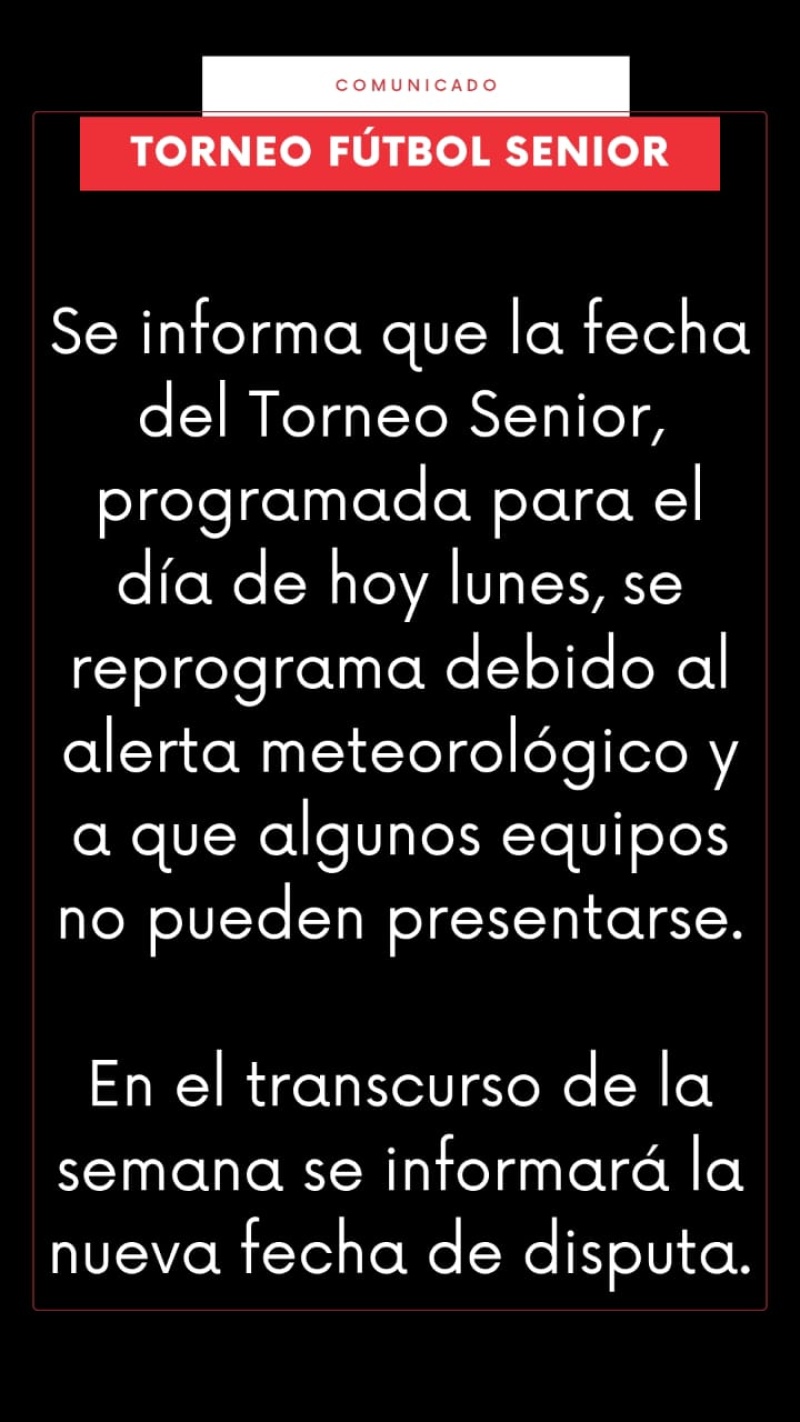 Se informa que la fecha del Torneo Senior programada para el día de hoy lunes se reprograma debido al alerta meteorológico y a que algunos equipos no pueden presentarse.