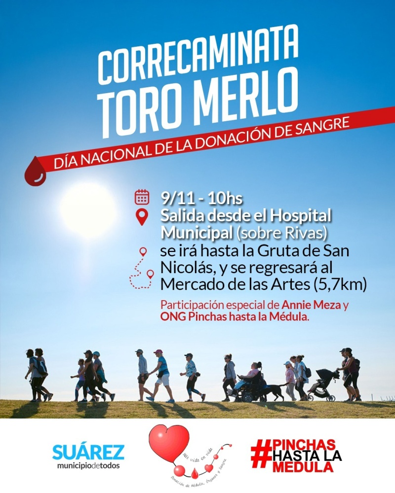 El próximo domingo 9 de noviembre, Coronel Suárez será sede de una nueva edición de la CorreCaminata Toro Merlo, una actividad solidaria y recreativa organizada por la ONG Más Vida en Vida, junto a la ONG Pinchas hasta la Médula y otras instituciones locales, en el marco del Día Nacional del Donante de Sangre.