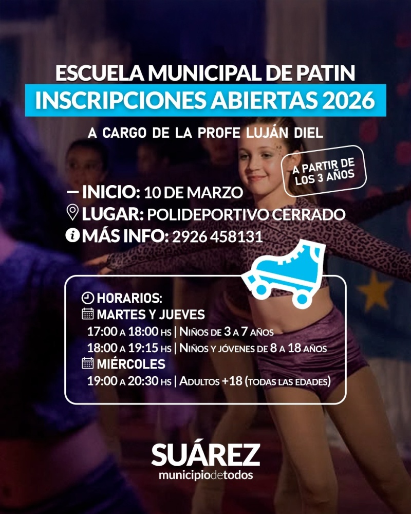 Ya están abiertas las inscripciones para la Escuela Municipal de Patín, a cargo de la profesora Luján Diel. Desde los 3 años podés iniciarte en esta hermosa disciplina y disfrutar del patinaje artístico en un espacio recreativo, formativo y lleno de energía.
