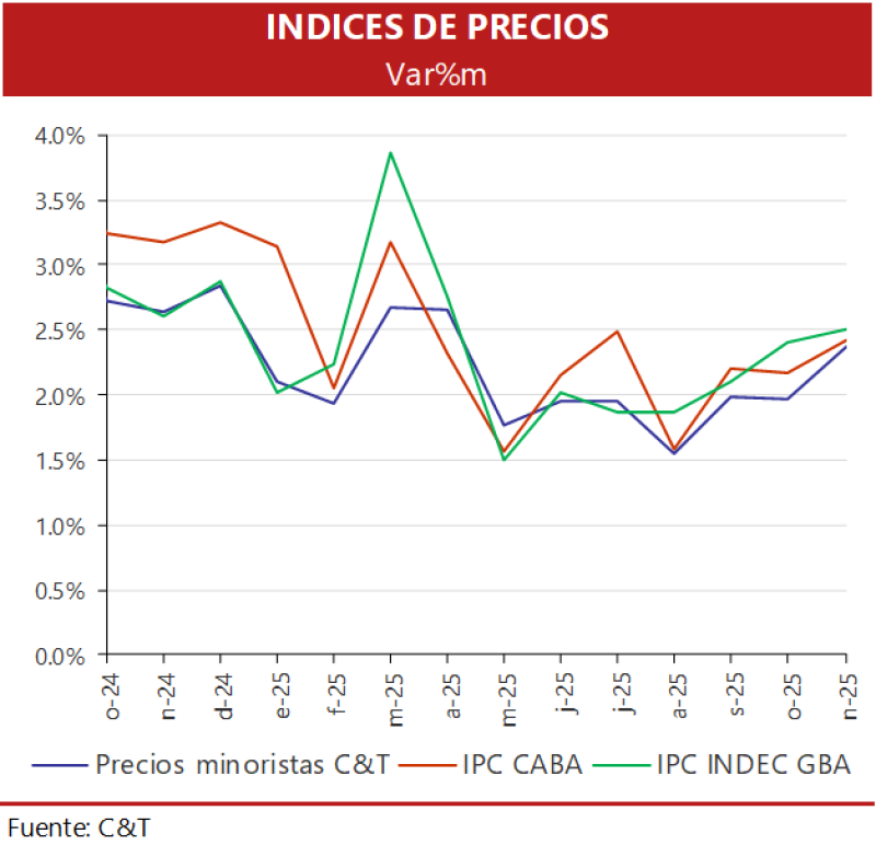 En el otro extremo, el Cyber Monday de principios de mes favoreció que equipamiento y mantenimiento del hogar e indumentaria subieran apenas 1,1% y 0,5% respectivamente.