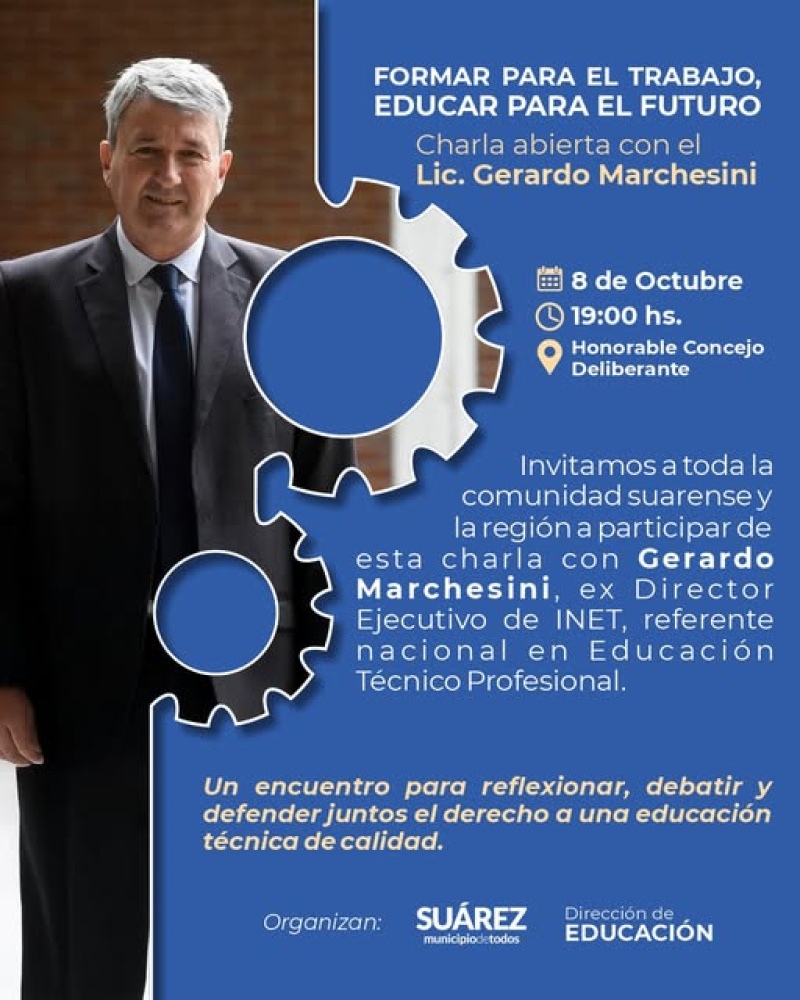 Hoy miércoles 8 de octubre, a las 19 horas, en el recinto del Honorable Concejo Deliberante de Coronel Suárez, recibiremos al destacado docente Licenciado Gerardo Marchesini, quien fuera Director Ejecutivo del Instituto Nacional de Educación Tecnológica (INET) durante la gestión del ministro Jaime Perczyk.