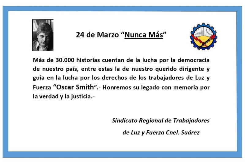 Más de 30.000 historias cuentan de la lucha por la democracia de nuestro país, entre estas la de nuestro querido dirigente y guía en la lucha por los derechos de los trabajadores de Luz y Fuerza “Oscar Smith”.- Honremos su legado con memoria por la verdad y la justicia.-