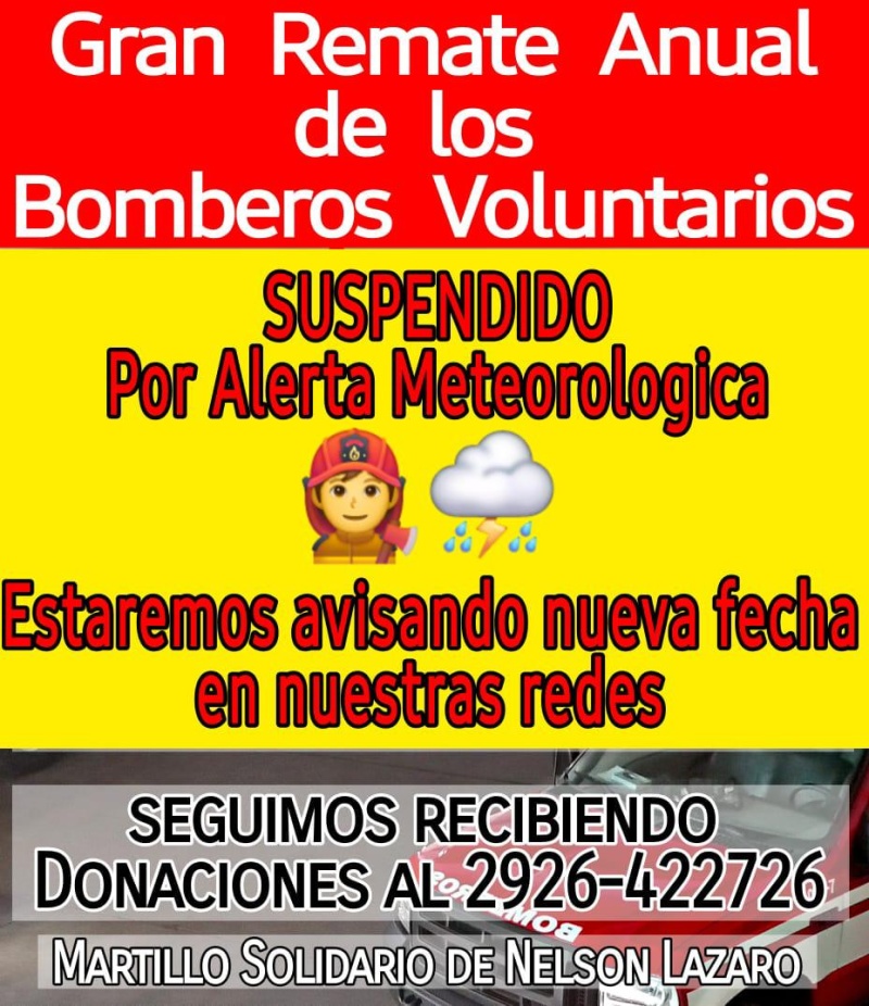 14/11/2025 • INSTITUCIONESComunicado de Bomberos Voluntarios, se suspende hasta nuevo aviso el remate anual organizado para este sábado Si te parece interesante compartilo con tus amigos