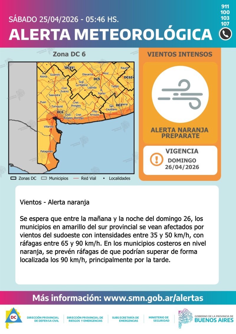 Se espera que, con el desarrollo de un sistema de baja presión al sudeste de la provincia de Buenos Aires durante el domingo 26 de abril, se produzca un incremento de los vientos del sudoeste sobre gran parte del territorio provincial. Las velocidades medias oscilarán entre 35 y 50 km/h, con ráfagas de entre 65 y 90 km/h sobre los municipios en alerta amarillo de las zonas DC 6 y 7. En los municipios costeros en alerta naranja, se prevén ráfagas que podrían superar localmente los 90 km/h, principalmente por la tarde.