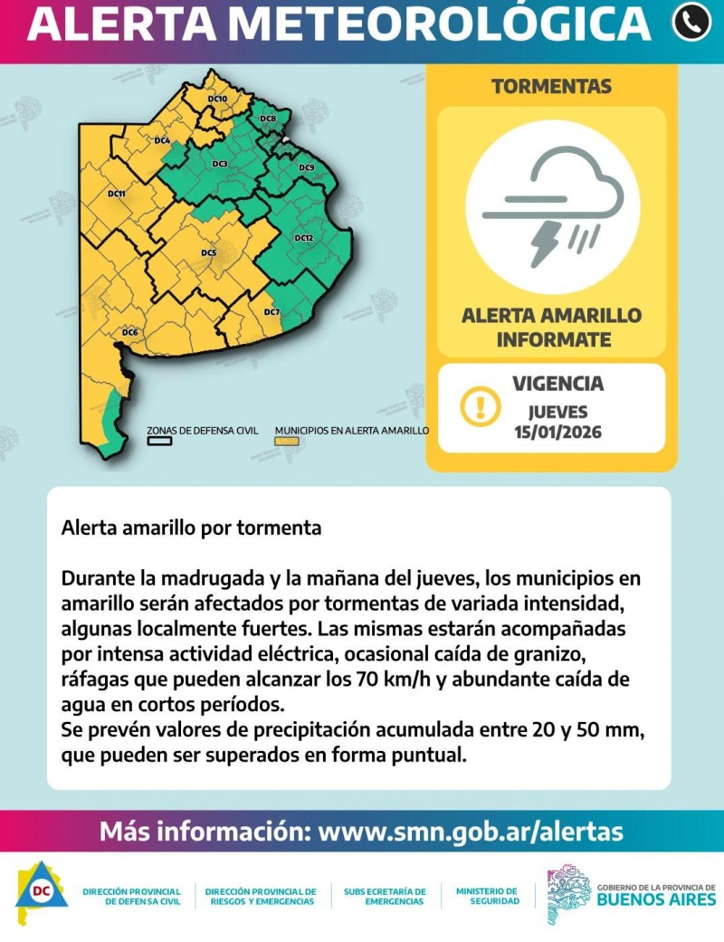 Se espera con estas tormentas del jueves en las 15 provincias mencionadas una intensa actividad eléctrica, ocasional caída de granizo, ráfagas que pueden alcanzar los 70 km/h y abundante caída de agua en cortos períodos. Se prevén valores de precipitación acumulada entre 20 y 50 mm, que pueden ser superados en forma puntual, según la alerta temprana emitida por el SMN.