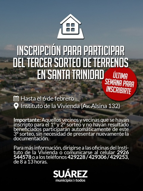 Municipio AYER Este lunes Campaña de Vacunación Antirrábica en Barrio Puente Chico 05/02/2026 Mauro Moccero: gestiones en La Plata, obras en marcha y un año desafiante para Coronel Suárez 05/02/2026 Mantener los terrenos limpios es responsabilidad de todos 02/02/2026 Informacion Municipal, emergencia sanitaria en Coronel Suárez AYER El tejo vuelve a ser protagonista en una noche única: Torneo Regional de Tejo Nocturno 05/02/2026 El intendente Ricardo Moccero recibió a representantes de la empresa NEC para avanzar en tecnología aplicada a la seguridad 04/02/2026 Cerro del Amor: una leyenda que vuelve a latir este 14 de febrero en Villa La Arcadia 31/01/2026 Obras, educación y ambiente: Mauro Moccero llevó a Suárez a la agenda provincial 07/02/2026 Nuevas maquinarias para la Planta de Reciclado y el Aeródromo Municipal 05/02/2026 Impuesto a los Automotores: vehículos modelo 2014 y 2015 02/02/2026 ¡ÚLTIMA SEMANA DE INSCRIPCIÓN! 31/01/2026 Producción y empleo local: el Banco Provincia otorgó en 2025 más de $30 millones en microcréditos a tasa subsidiada en Coronel Suárez Cargando...