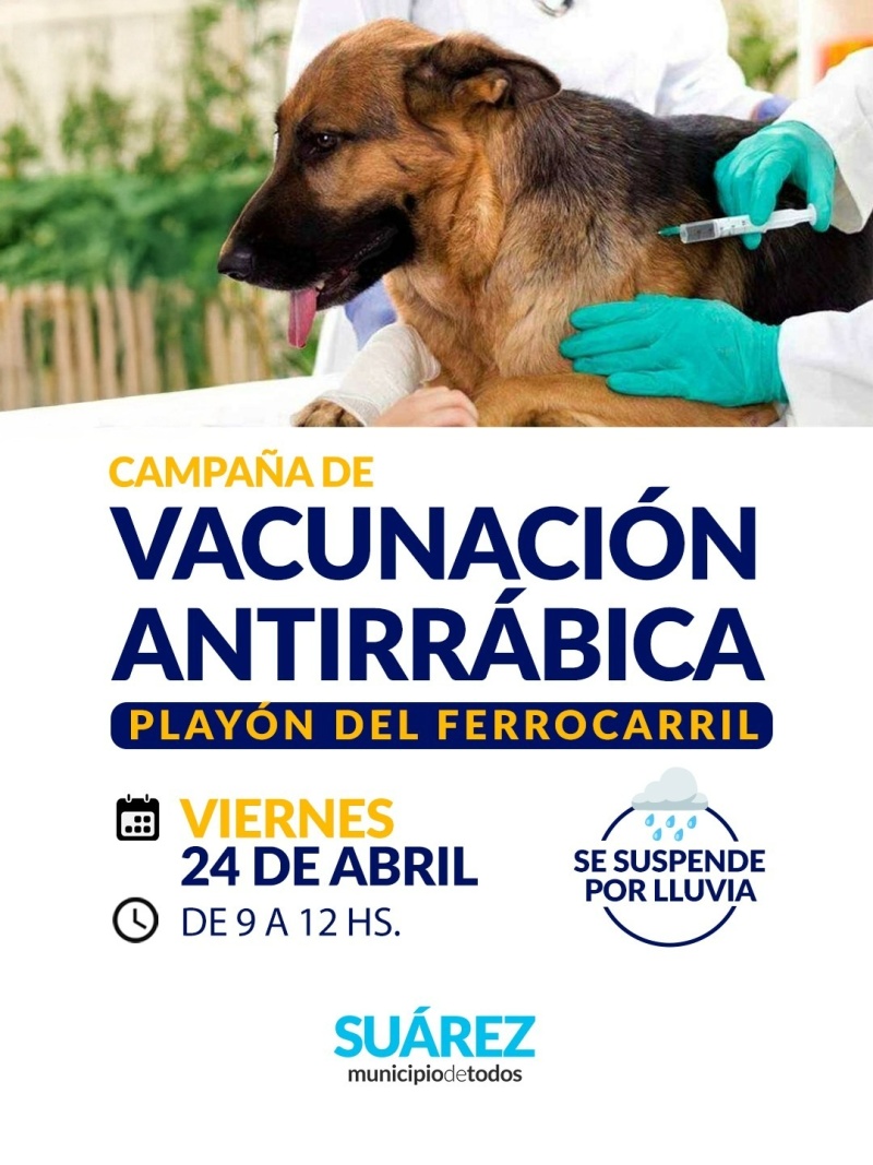El equipo de profesionales desarrollará este VIERNES 24 DE ABRIL, una nueva jornada de vacunación antirrábica gratuita para perros y gatos en el Playón del Ferrocarril.