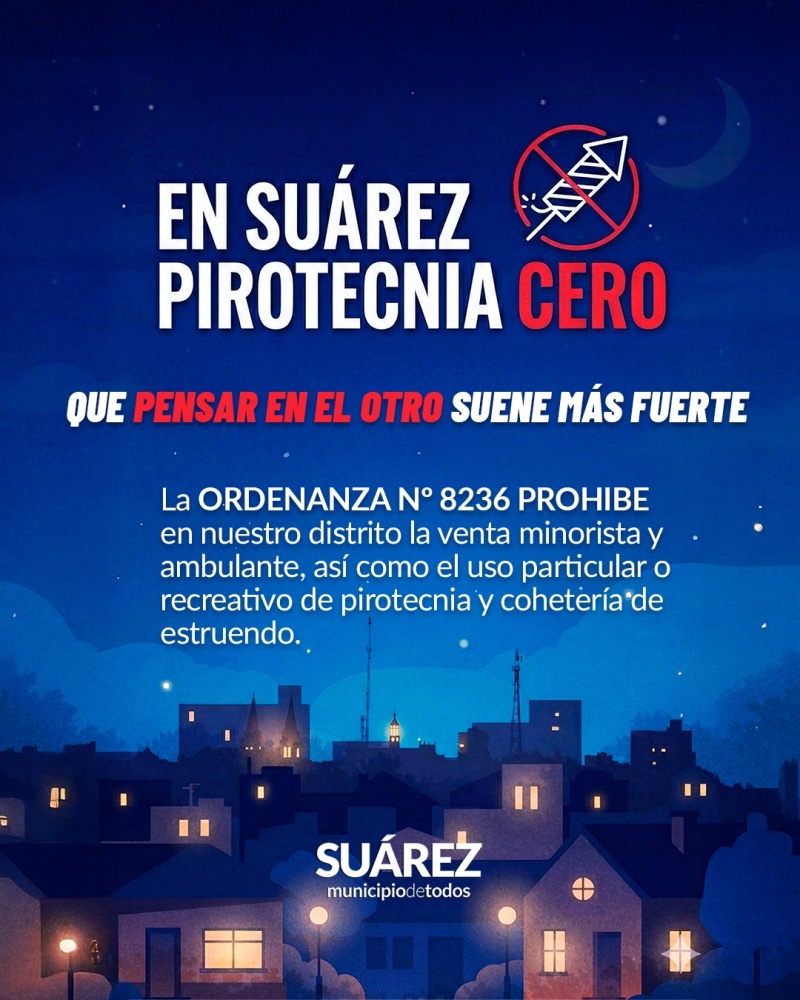 De acuerdo a la Ordenanza Nº 8236, en el distrito de Coronel Suárez está prohibida la venta minorista y ambulante, así como el uso particular o recreativo de pirotecnia y cohetería de estruendo.