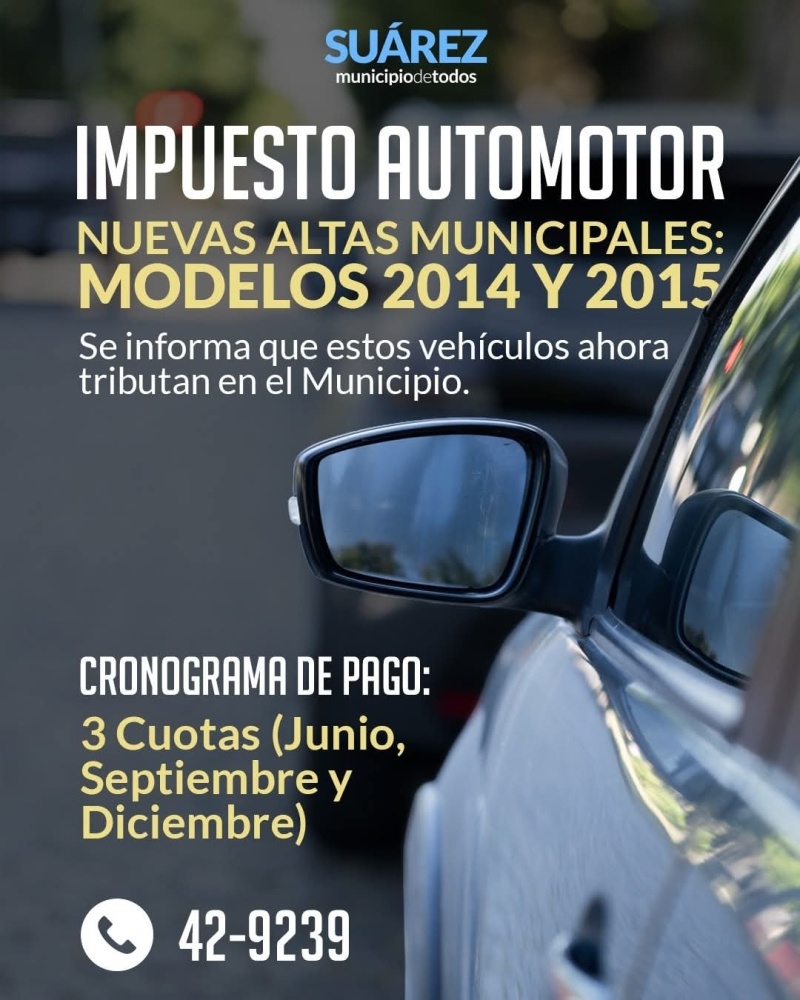 La Oficina de Automotores de la Municipalidad de Coronel Suárez informa que, en el marco de la Ley Impositiva Provincial N° 15.558 (año 2026), la Provincia de Buenos Aires transfirió a los municipios la administración y el cobro del Impuesto a los Automotores correspondiente a los vehículos modelo año 2014 y 2015.