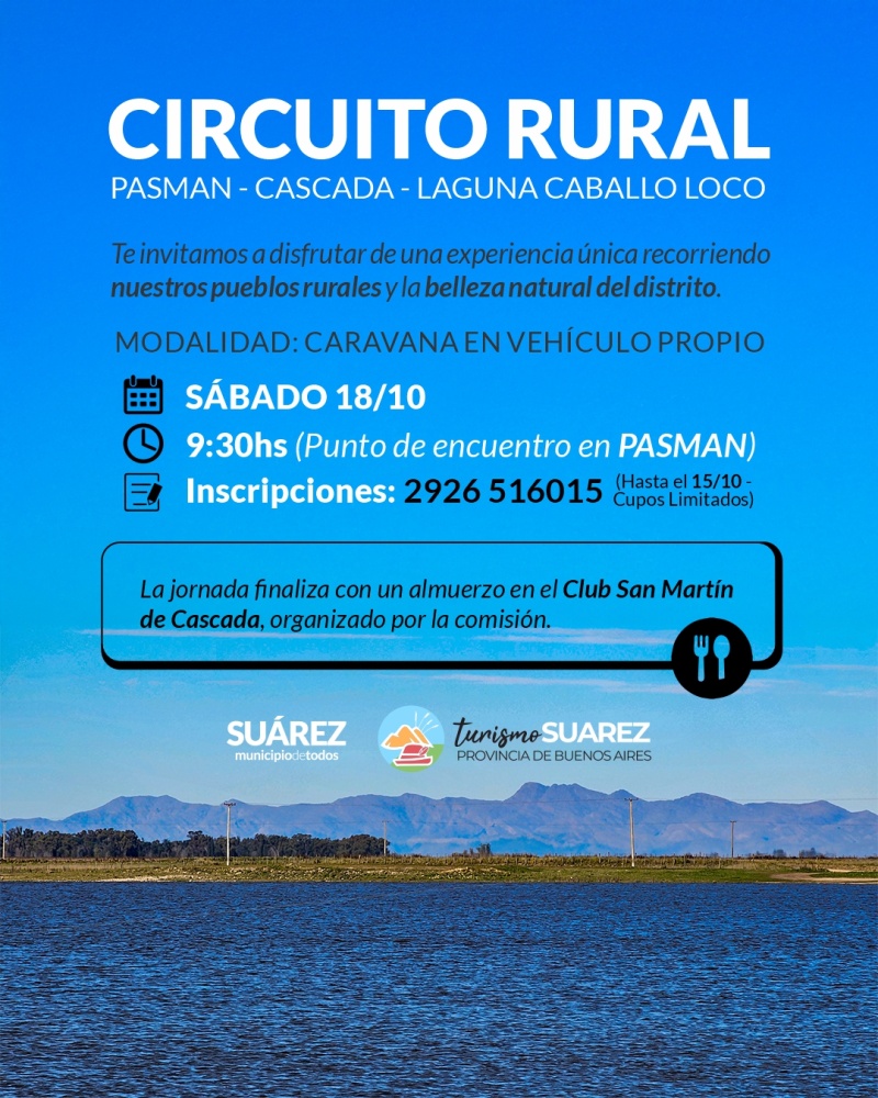 El recorrido comenzará en Pasman, para continuar por la Laguna Caballo Loco, la única laguna de Coronel Suárez, donde observaremos el entorno de pastizales y sierras que invita a la calma, al contacto con la naturaleza y a redescubrir nuestra historia rural. Finaliza en Cascada con recorrida por el pueblo.