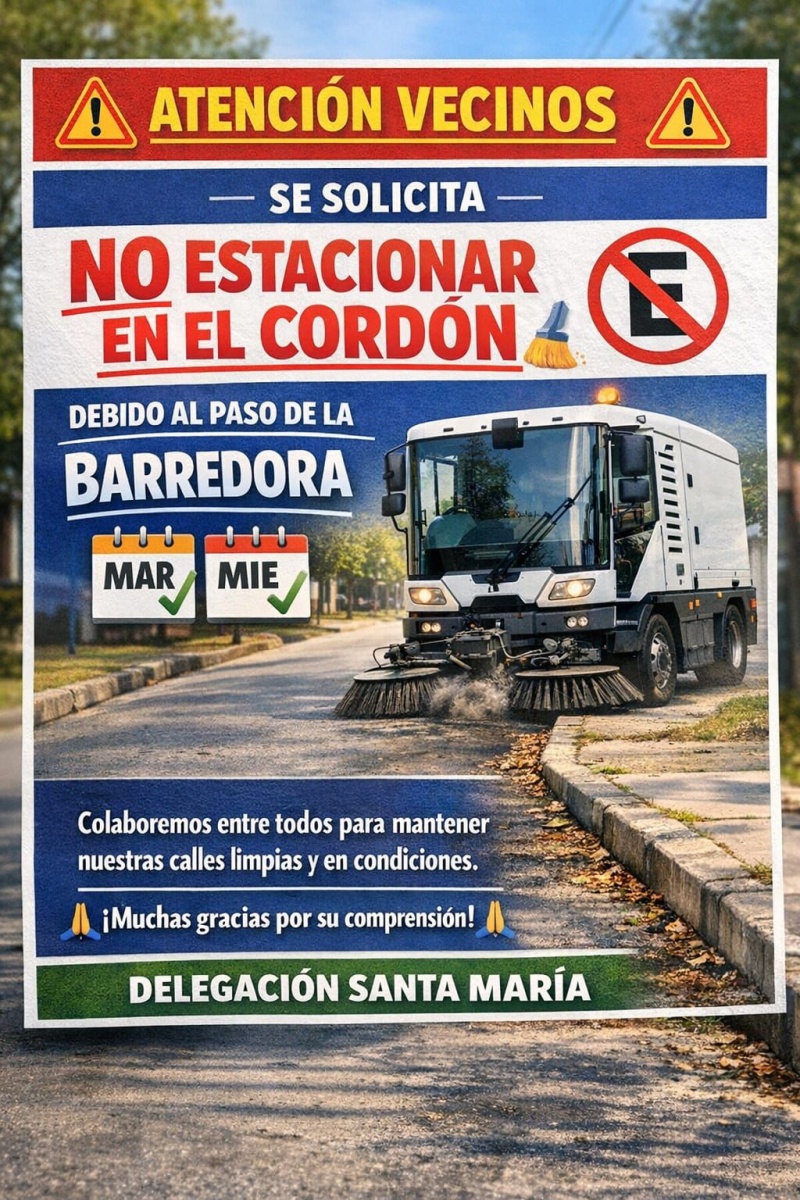 Se les solicita a los frentistas que el día martes y miércoles no dejen estacionados sus vehículos en la calle debido a que la barredora recorrerá distintas arterias.