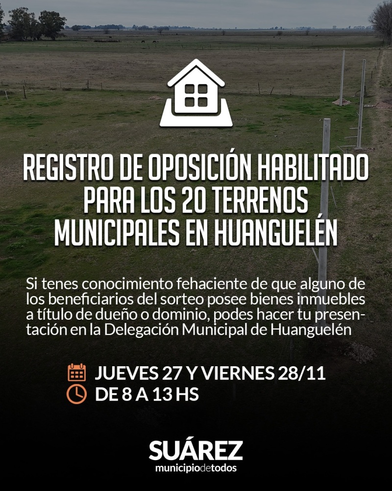 En el marco del sorteo de terrenos realizado la semana pasada, se informa que ya se encuentra habilitado el Registro de Oposición.