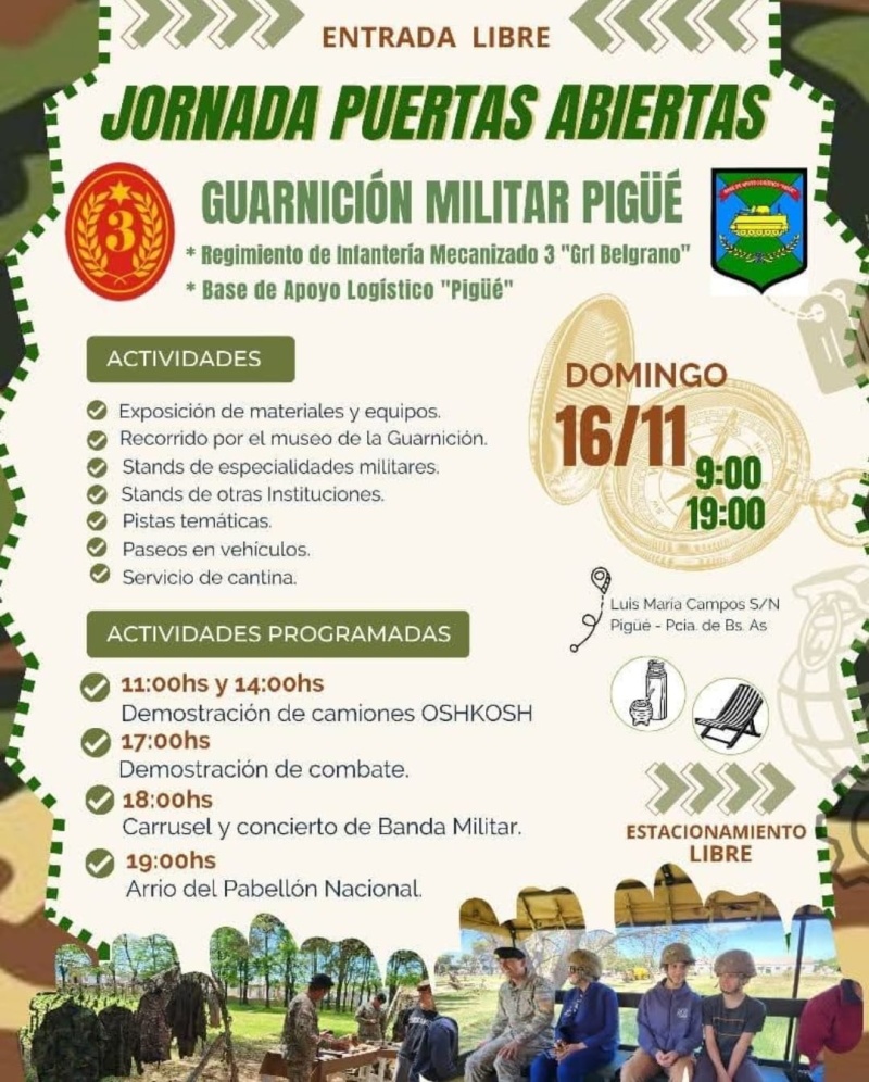 La Guarnición Militar de Pigüé realizará este domingo 16 una nueva edición de la tradicional Jornada de Puertas Abiertas, una propuesta que año tras año convoca a cientos de vecinos de toda la región interesados en conocer desde adentro el trabajo del Regimiento de Infantería Mecanizado 3 “General Belgrano” y de la Base de Apoyo Logístico Pigüé.