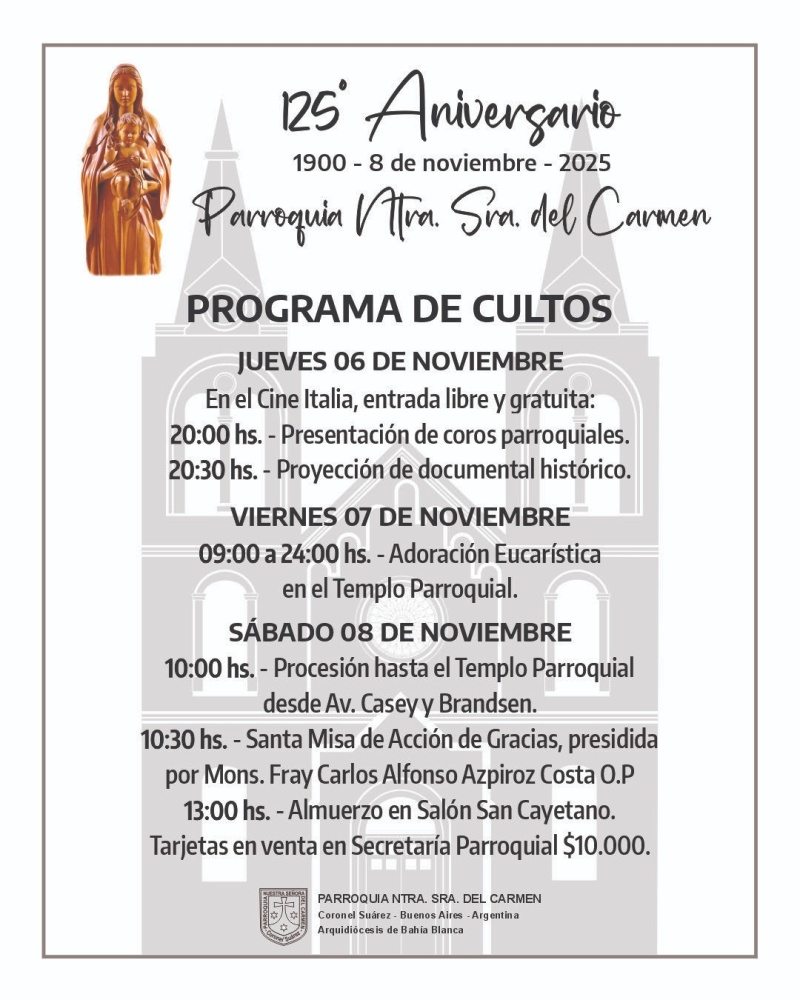 1900 - 8 de noviembre – 2025, 125º aniversario de la Parroquia Nuestra Señora del Carmen: Programa de Cultos