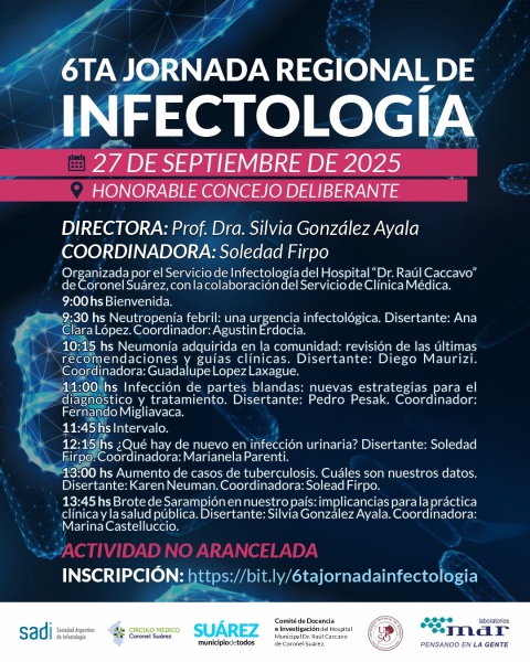 Salud HOY El cardiólogo Mariano Sein alertó sobre los riesgos de la sal oculta en los alimentos 29/09/2025 Soledad Firpo y Silvia González Ayala abrieron la 6ª Jornada Regional de Infectología con un fuerte llamado a la prevención 27/09/2025 La Dra. Belén Hirigoity brindó recomendaciones para prevenir alergias y cuidar la piel en primavera 25/09/2025 El próximo sábado 27 de septiembre a las 9 hs en el Honorable Concejo Deliberante, 6ta Jornada Regional de Infectología HOY Caminata saludable por la diabetes en Barrio Rosario 29/09/2025 Diego Maurizi y el desafío de enfrentar la neumonía con prevención y diagnóstico 26/09/2025 El cardiólogo Mariano Sein derriba mitos sobre aceites, colesterol y triglicéridos 25/09/2025 Pablo Juliano sobre el caso del fentanilo contaminado: una masacre silenciosa que obliga a una comisión investigadora 30/09/2025 Un paso adelante a la longevidad: el rol de los tratamientos médicos personalizados con IA 29/09/2025 Ahora te podés vacunar contra el dengue de forma segura y gratuita 26/09/2025 Espacio Saludable en Villa Belgrano “Tu CAPS cuida tu salud” 23/09/2025 Marina Vigatto describió la realidad social de Coronel Suárez y el trabajo de Desarrollo Social Cargando...