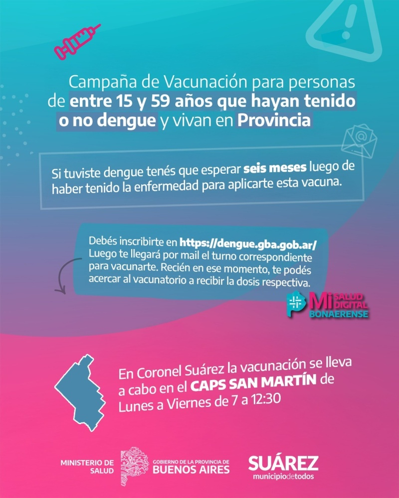 La vacunación en Coronel Suárez se lleva a cabo en el CAPS San Martín, de lunes a viernes, en el horario de 7 a 12:30hs.