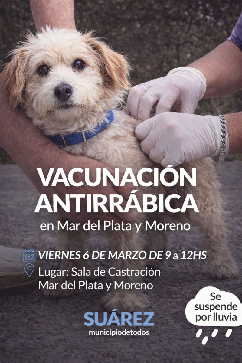 El equipo de profesionales desarrollará el viernes 6 de marzo una nueva jornada de vacunación antirrábica gratuita para perros y gatos en la Sala de Castración de calle Mar del Plata y Moreno –ex corralón municipal-.