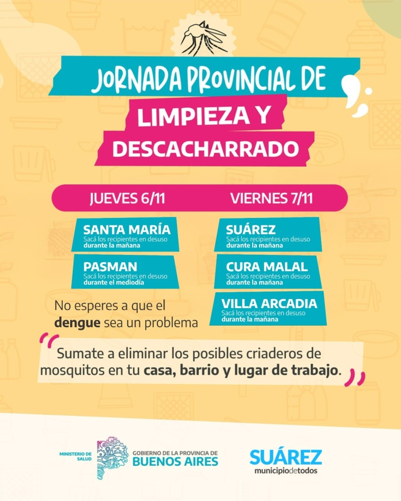 Con el objetivo de prevenir la reproducción del mosquito transmisor del dengue, la Gestión de Gobierno Municipal, a través de la Secretaría de Salud, se suma a la Jornada Provincial de Descacharrado, una acción conjunta impulsada desde el Ministerio de Salud bonaerense.