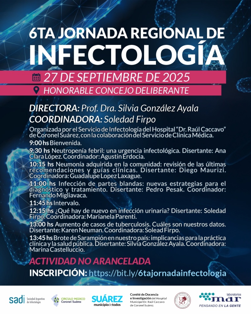 El próximo sábado 27 de septiembre a las 9 hs en el Honorable Concejo Deliberante, 6ta Jornada Regional de Infectología