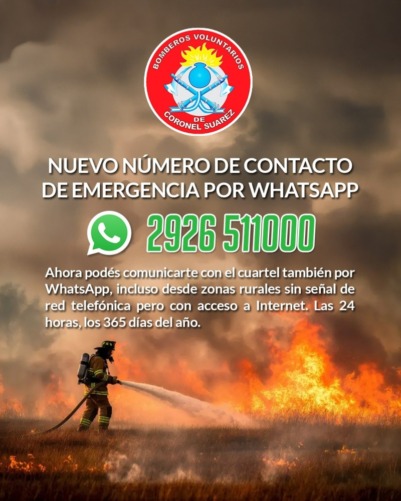 Bomberos Voluntarios Coronel Suárez pone a disposición el número celular 2926 511000, el cual permitirá la comunicación de emergencia con el Cuartel mediante llamadas de WhatsApp desde zonas con nula señal de la red de telefonía tradicional que tengan acceso a conexiones de Internet.