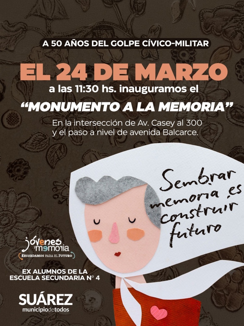 En el marco de los 50 años del golpe cívico-militar, Coronel Suárez se suma al homenaje permanente a la memoria y a la lucha colectiva por no olvidar, acompañando la materialización de un proyecto impulsado por ex alumnos de la Escuela Secundaria N° 4.