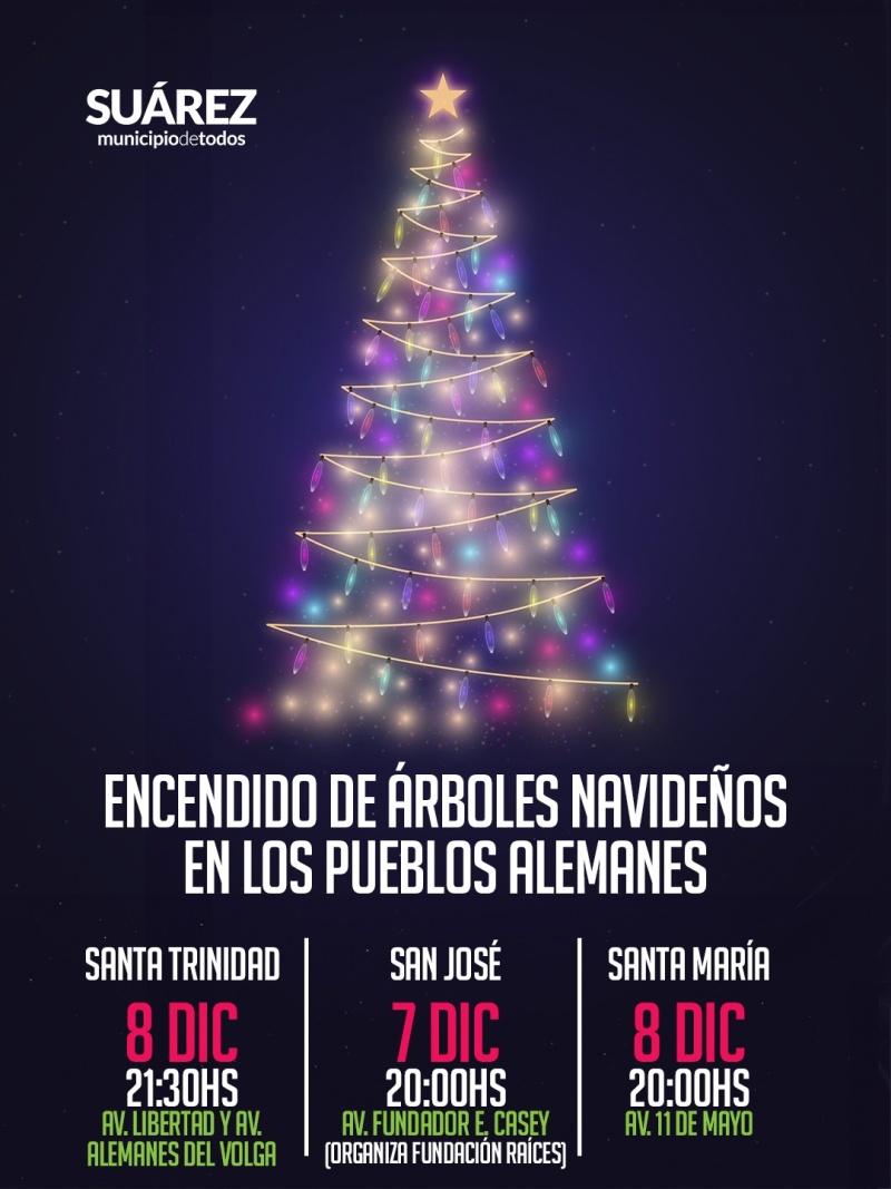 Como cada año, la magia de la Navidad vuelve a encontrarnos en los Pueblos Alemanes y en Coronel Suárez para celebrar el tradicional encendido de los árboles navideños, una costumbre que une a las familias, colma de emoción a la comunidad y nos prepara con fe y esperanza para la llegada de la Nochebuena.