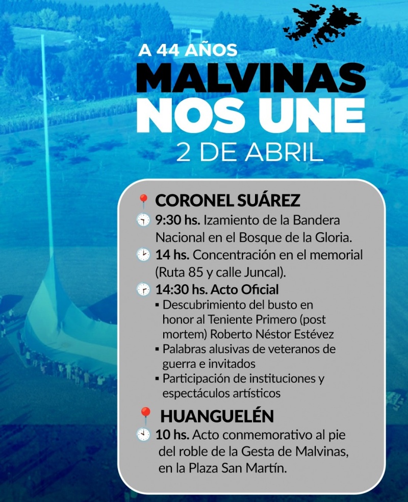 Este 2 de abril, en el marco del 44° aniversario de la Gesta de Malvinas, se invita a los vecinos a ser parte de los actos conmemorativos que se desarrollarán tanto en Huanguelén como en la ciudad cabecera, en homenaje a quienes defendieron la patria con valentía y entrega, en una jornada cargada de emoción y memoria.