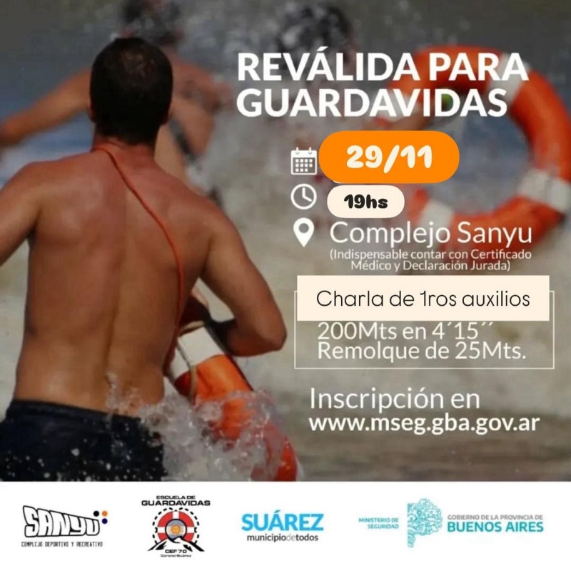 Este sábado 29 a las 19 hs en instalaciones del complejo Deportivo Sanyu se llevará a cabo la prueba anual de suficiencia para Guardavidas.