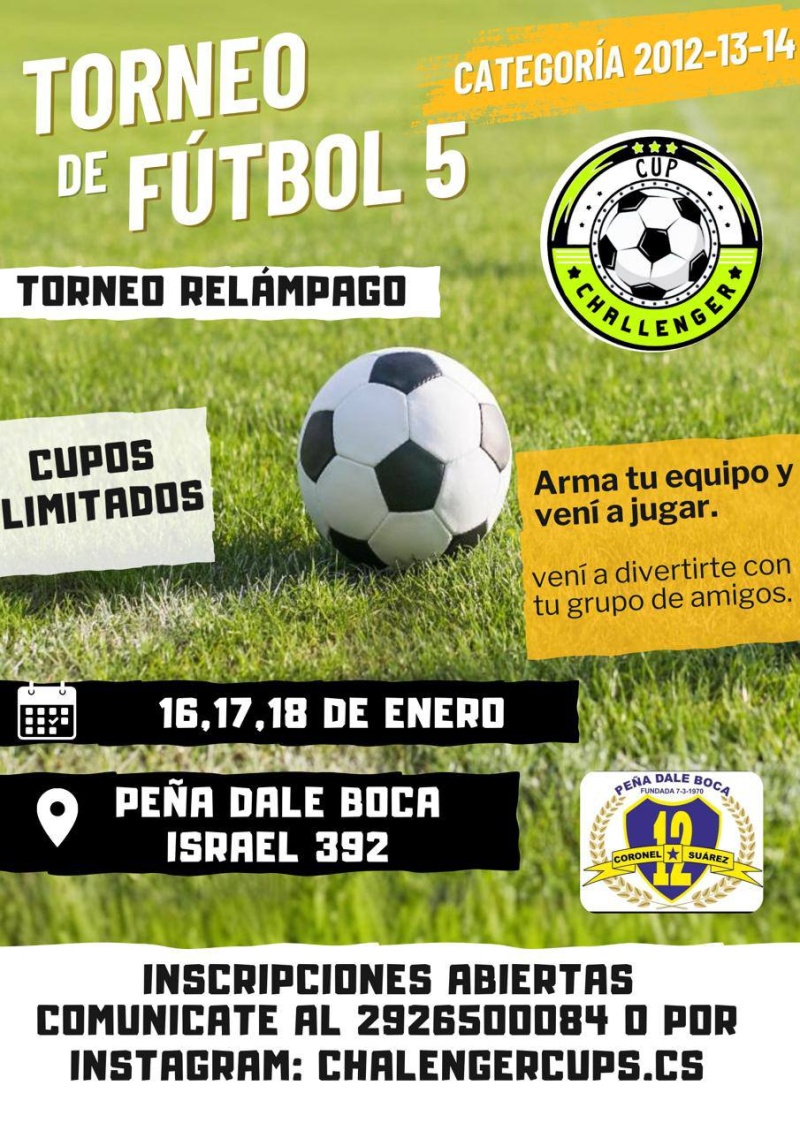 07/01/2026 • SOCIEDADTorneo de fútbol 5 en la Peña Dale Boca, categorías 2012-13-14. ¡Arma tu equipo y vení a jugar! Inscripción 2926-500084 Si te parece interesante compartilo con tus amigos